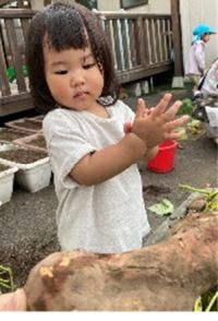 5月は雨上がりの田んぼに出掛る機会が多くあり、日によって変わる泥の固さや水たまりの大きさに「今日はどうかな?」と期待しながら、天気の良い日は戸外へ出かけていきました。水たまりや、泥んこを見つけると嬉しそうに近づき、そーっと足を入れ、手を入れ、最後は思いっきり足踏みをして全身で楽しんだ子ども達。また、タンネのお山では、筍を発見。普段触れる事のない植物に掘ったり、握ったり、皮を剥いたりしながら、春ならではの旬物に興味津々の様子でした。 |
