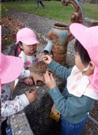子ども達は、お気に入りの棒や枝を見つけて山の散策をしたり、ドングリや木の実を集めごちそう作りをしたりとそれぞれの遊びを楽しんでいます。 |