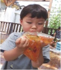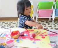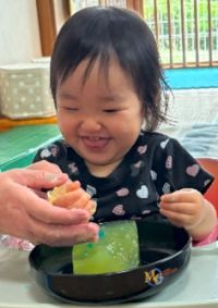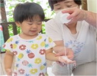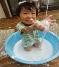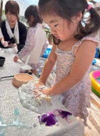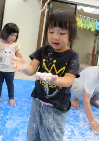 7月に入り梅雨の戻りの様な雨続きの毎日となりました。楽しみにしていた水遊びが出来ない日もあり、そんな日は室内やデッキで夏ならではの感触遊びを楽しみました。小麦粉粘土や片栗粉を使ったスライムづくり、泡遊びに色水づくり。初めての感触に何だろう…と不思議そうに見つめたり、恐る恐る触ってみたり、戸惑いや感動の表情を見せながらも先生や友達と一緒に楽しみました。 |