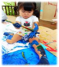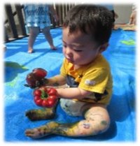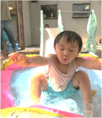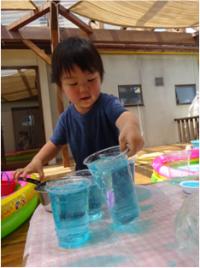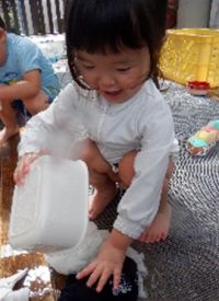 梅雨が明け、朝から蒸し暑い日が続いていますが、子ども達は大好きな水遊びに歓声を上げ、デッキへと向かっています。ブルーシートで作った浅くて大きなプールでは、ワニやゾウ、サルなどの様々な動物に変身!!足を大きく上げたり、バチャバチャと足踏みをしながら、水しぶきの変化を楽しんでいます。色水作りや水の移し替えなども大好き!冷たい水に触れながら、自分の好きな楽しみ方で水に慣れ親しんでいます。 |