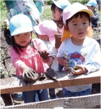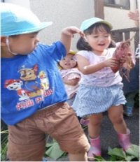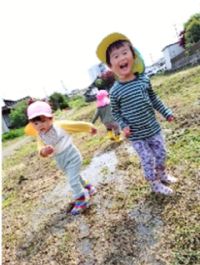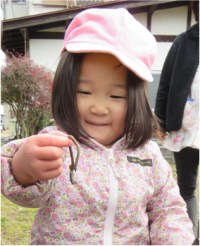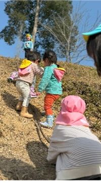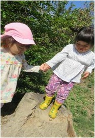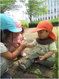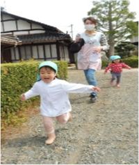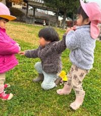 新しい環境にも慣れ、天気の良い日には大好きな先生やお友だちと戸外遊びを楽しんでいる子ども達。田んぼでは、冬眠から目覚めた蛙がひょっこり出てくることもあり、「おったよ!」「見せてー」と捕まえたり追いかけたりを楽しんでいます。ダンゴムシや蝶々、タンポポにつくしなど、この時期ならではの出会いと発見に子ども達の興味は尽きることはありません。いつの間にか自分で虫を捕まえられるようになっていたり、小さな段差や斜面を駆け足やジャンプで乗り越えたりと、日々成長していく子ども達に目を見張るばかりです。 |