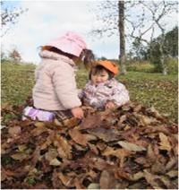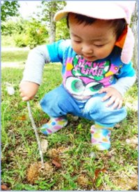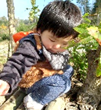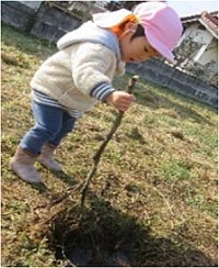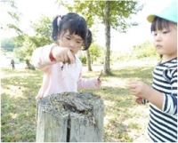 子ども達は、お気に入りの棒や枝を見つけて山の散策をしたり、ドングリや木の実を集めごちそう作りをしたりとそれぞれの遊びを楽しんでいます。 |