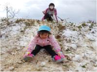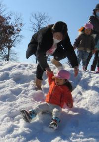 年始に降り積もった雪が、しばらくの間田んぼに残り、子ども達は雪遊びを楽しみました。 |
