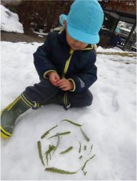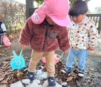 今季2度目の大寒波がやってきて、寒い日が続いています。天気の良い日には戸外へ出かけた子ども達。日陰に残った雪が、ツルツル、ガチガチ、ザクザクと日に日に形や感触を変えていく様子に、雪の上を滑ったり、棒で砕いてみたりと固い雪の感触を楽しみ、遊びに取り入れていました。 |