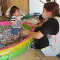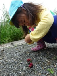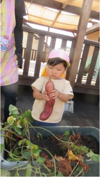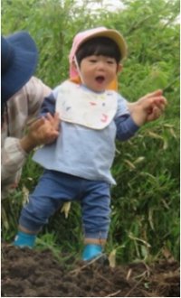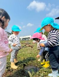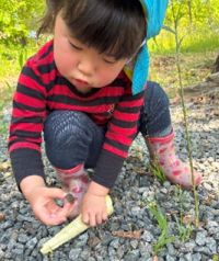 5月は雨上がりの田んぼに出掛る機会が多くあり、日によって変わる泥の固さや水たまりの大きさに「今日はどうかな?」と期待しながら、天気の良い日は戸外へ出かけていきました。水たまりや、泥んこを見つけると嬉しそうに近づき、そーっと足を入れ、手を入れ、最後は思いっきり足踏みをして全身で楽しんだ子ども達。また、タンネのお山では、筍を発見。普段触れる事のない植物に掘ったり、握ったり、皮を剥いたりしながら、春ならではの旬物に興味津々の様子でした。 |
