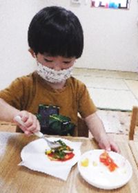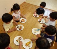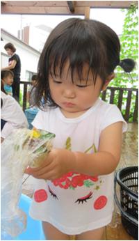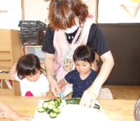 今年は例年通りの梅雨明けとなるとのことで、もうしばらく雨雲とにらめっこの日が続きそうです。プランターの朝顔がすくすくとつるを伸ばし、野菜たちもぐんぐんと生長している今日この頃。先日、収穫したきゅうりやラディッシュを早速くま組で試食しました。ラディッシュを食べた子ども達、「すっごい辛い!」「唐辛子じゃないか!?」と、驚いた様子でしたが、友達とならちょっぴり苦手な野菜も食べることに挑戦できたようです。これからたくさん収穫できることを期待し、子ども達と一緒に育て、色々な野菜を味わいたいと思います。 |