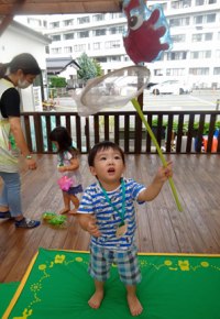 異例ともいえる猛暑の中、外遊びが制限される日々ですが、子ども達はデッキでの水遊びをほぼ毎日楽しみました。暑さが和らいでくれば、保育所周辺の散策やタンネのお山にも行きたいと思います。 |