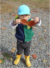 心地よい秋風を感じられる日に、保育所周辺の散歩へと出かけた子ども達。「何かおるかね?」と胸を弾ませ、元気に出発!カマキリや蝶を見つけたり、どんぐりを拾ったりと久しぶりの散歩を楽しみました。本格的な活動シーズンを迎え、秋ならではのフィールドを生かし、身近な自然の中で動植物との触れ合いや発見を楽しんでいきたいと思います。 |