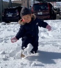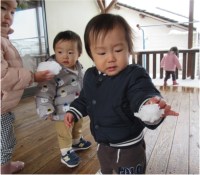 雪遊びができるほどの積雪となり、子ども達と早速田んぼへ出かけました。真っ白な雪の上を歩き進んでいくと、一面に足跡。「わ~、僕の足跡でいっぱい!」(雪を蹴って出来た雪玉を見て)「雪だるまが飛んでる!」と楽しそうに新雪を歩く子ども達。フカフカの雪の上で寝転んでみたり、雪投げや斜面滑りなど思い思いに楽しみました。 |