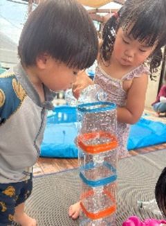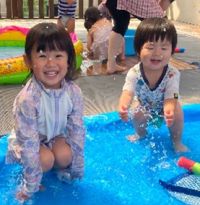 子ども達はプールの中に入り全身で水浴びを楽しんだり、お友だちや先生と手作り水鉄砲で水を掛け合ったり、雨樋を使って水風船やペットボトルを転がしてみたりと、思い思いに水遊びを楽しんでいます。暑い暑い夏日が続きそうですが、たくさん遊んで、いっぱい食べて、そして水分補給や午睡でしっかりと休息を取りながら、体調管理に気を付けて今月も元気に過ごしたいと思います。 |