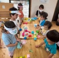 8月中旬から雨が続き各地に災害が発生するなか、庄原市にも避難情報が出て心配しましたが、暑い日にはウッドデッキでプール遊びや、色水作り等存分に水遊びを楽しむことができ、子ども達の成長を感じる場面が多々ありました。 |